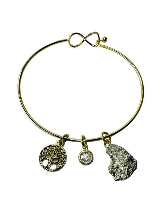 Natural Stone Trio Bracelet - Pirita (Pyrite), Zirconia Ponto de Luz (Zircone Point of Light) & Árvore da Vida (Tree of life) charm - Gold Plated