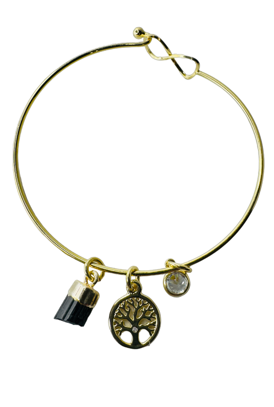 Natural Stone Trio Bracelet - Turmalina Negra (Black Tourmaline), Zirconia Ponto de Luz (Zirconia Point of Light) & Árvore da Vida (Tree of life) charm - Gold Plated