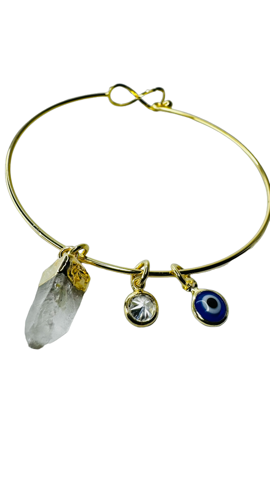 Natural Stone Trio Bracelet - Cristal De Rocha (Rock Crystal), Zirconia Ponto de Luz (Zirconia Point of Light) & Olho Grego (Evil Eye) charm - Gold Plated