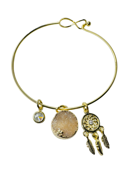 Natural Stone Trio Bracelet - Drusa de Ágata (Goddess Agate), Ponto de Luz Zirconia (Zirconia Point of Light) & Filtro dos Sonhos (Dreamcatcher) charm - Gold Plated