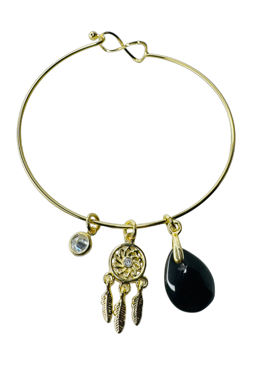 Natural Stone Trio Bracelet - Obsidiana Negra (Black Obsidian), Ponto de Luz Zirconia (Zirconia Point of Light) & Filtro dos Sonhos (Dreamcatcher) charm - Gold Plated