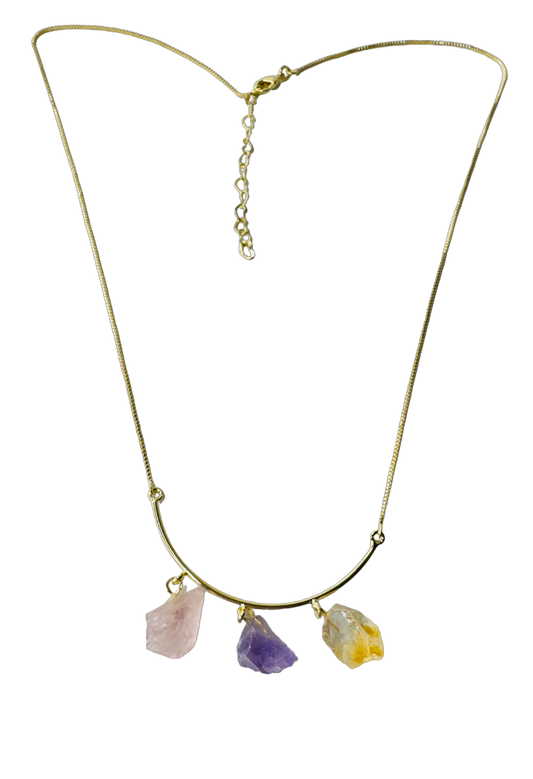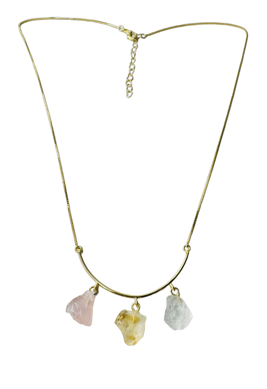 Half Moon Gold Plated Necklace Trio - Quartzo Rosa (Rose Quartz), Citrino (Citrine), and Cristal de Rocha (Rock Crystal)