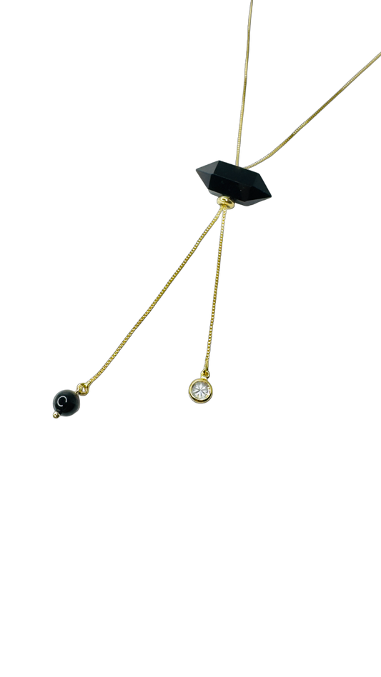 Gold Plated Tie Double Ended Necklace with Two Obsidiana Negra (Black Obsidian) and Zirconia Point of Light