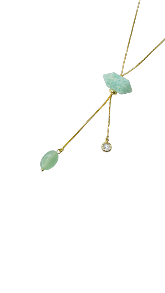 Gold Plated Tie Double Ended Necklace with Amazonita (Amazonite), Quartzo Verde (Green Quartz), and Zirconia Point of Light