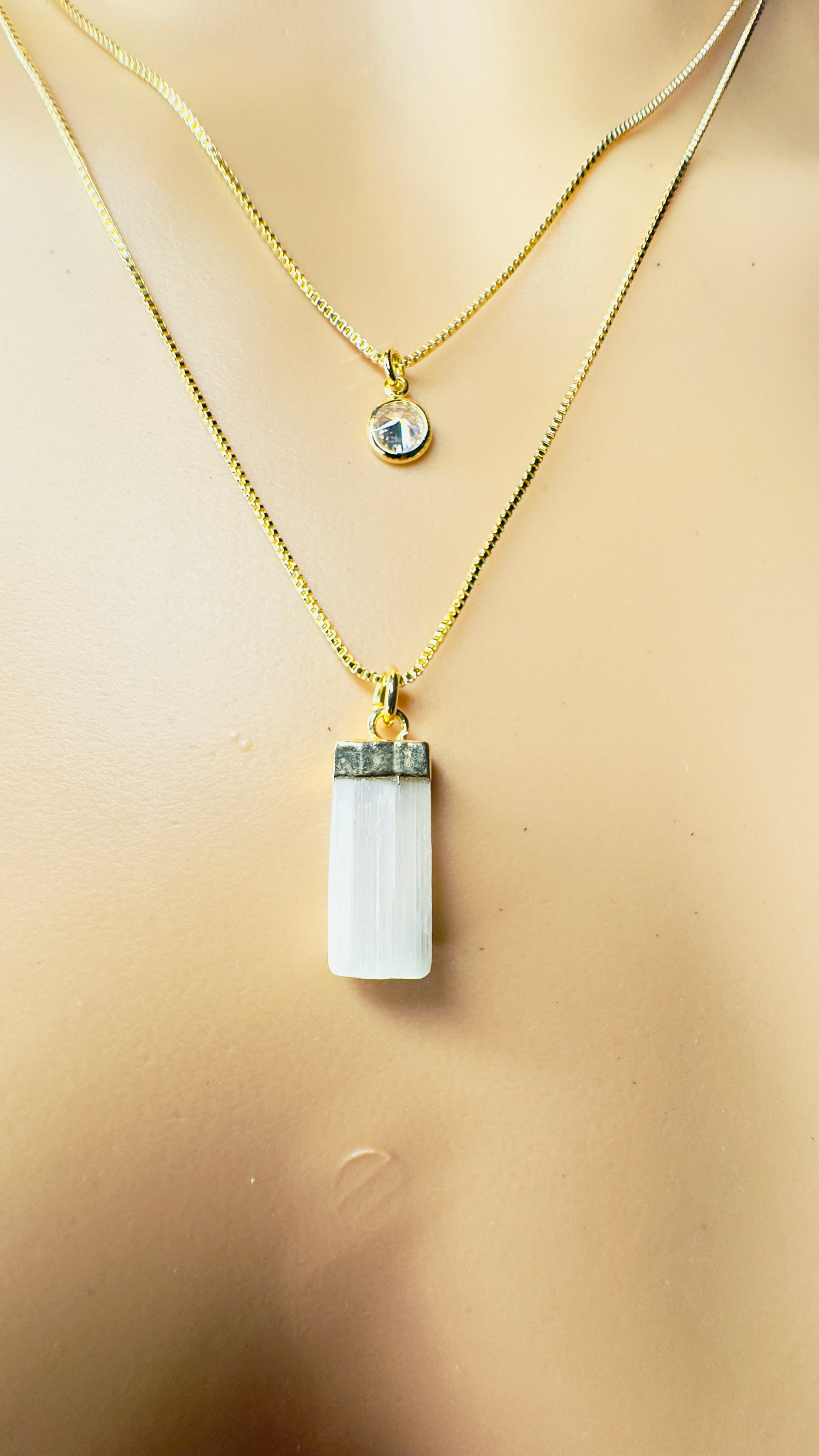 Gold Plated Point of Light Double String Necklace with Selenita Branca (White Selenite) and Zirconia