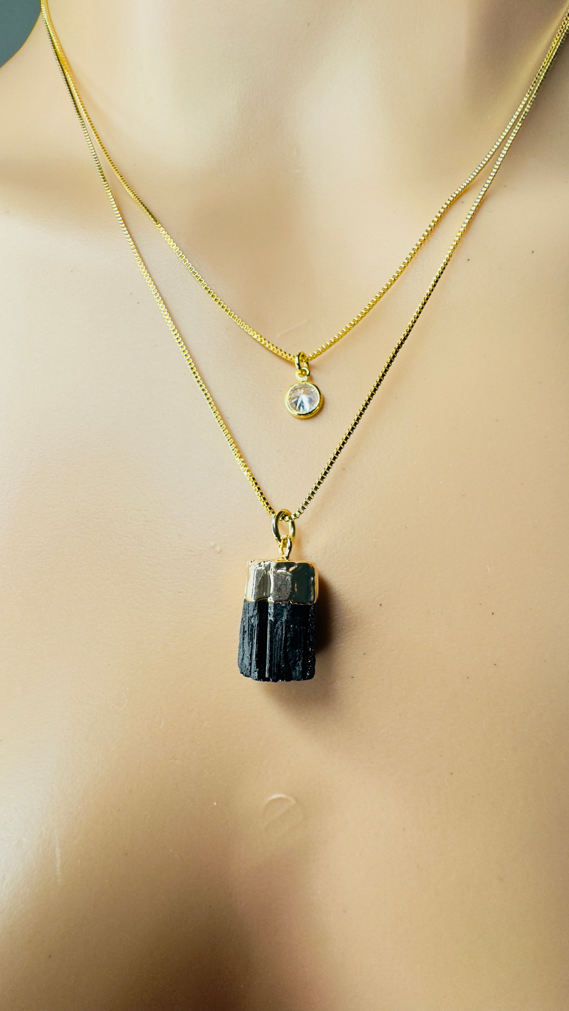 Gold Plated Point of Light Double String Necklace with Turmalina Negra (Black Tourmaline) and Zirconia