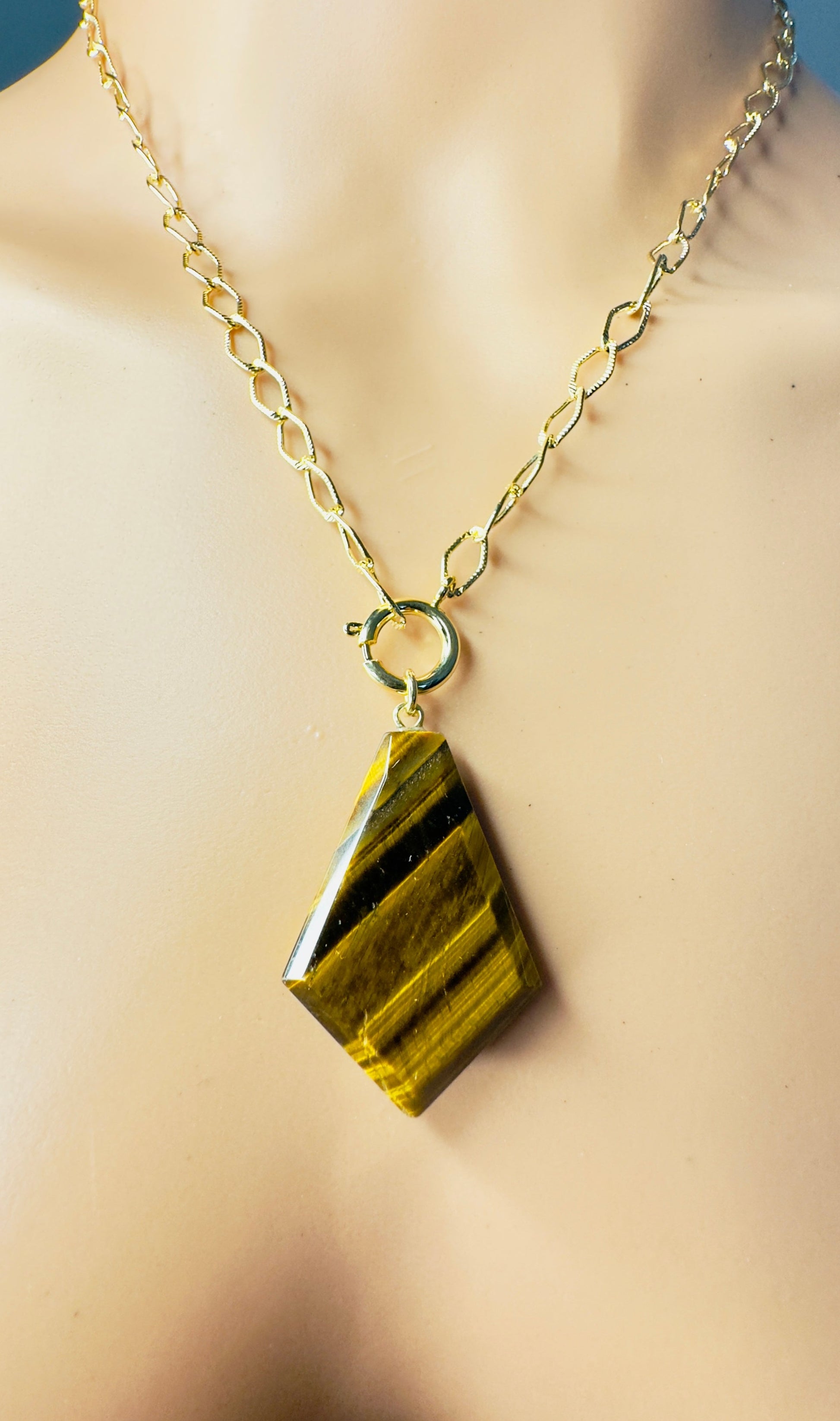 - Declaração Solo: Deixe a beleza ousada do pingente Olho de Tigre ocupar o centro das atenções usando o colar como uma peça independente, permitindo que ele chame atenção e admiração.